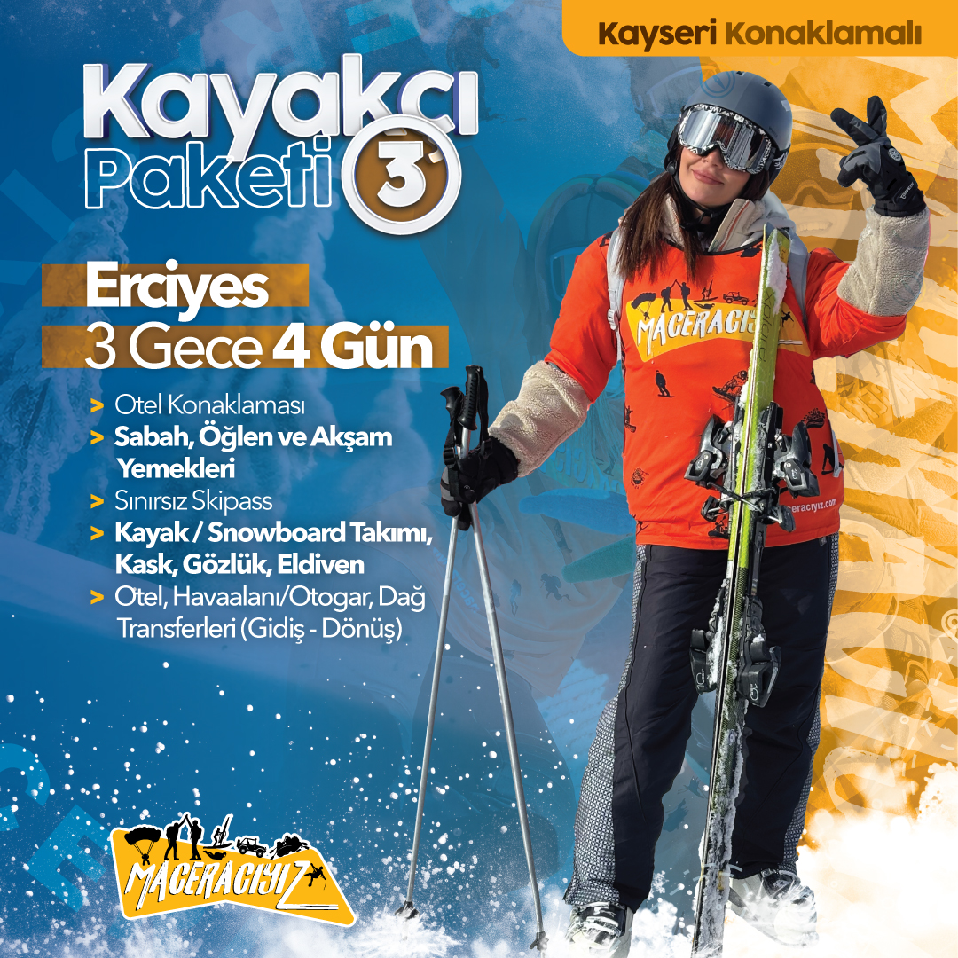 Otelde alacağımız sabah kahvaltısı sonrasında saat 08:30 da transfer aracımız ile Erciyes'e çıkıyoruz. Anlaşmalı işletmemizde tercihinize göre kayak veya snowboard ekipmanlarınızı, kask, gözlük ve eldivenlerinizi teslim alıyorsunuz. Bu ekipmanların tamamı ücrete dahildir. Sadece kıyafet kiralamak isteyenler ekstra ücret ödeyerek kar pantolonu ve kar mantonu günlük kiralayabilirler. Ekipman ve kıyafet işlemleri bittikten sonra lider ekibimizden Skipass kartlarınızı ve yemek fişimizi teslim alarak pistlere çıkarak kayak yapmaya start verebilirsiniz.