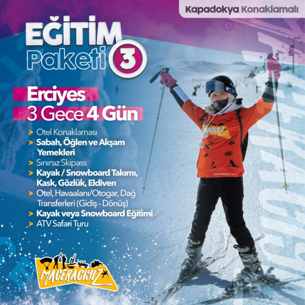Eğitimlerimiz gruplar halinde planlanmaktadır. Kayak eğitimi alacaklar için ayrı grup, snowboard eğitimi alacaklar için ayrı bir grup planlaması yapılmaktadır. Eğitim süresi 2 saattir. Bu eğitim sonrasında öğrendiğiniz bilgileri tekrarlamanız için pratik uygulaması için 2-3 saat serbest zamanda olacaksınız. Bu süreçte ve kayak tatilinizin son gününe kadar maceracıyız lider ekibi pistlerde her an yanınızda olacaktır. Lider ekibimizin de desteği ile artık kendi başınıza kayıyor olacak seviyeye gelmiş olacaksınız.